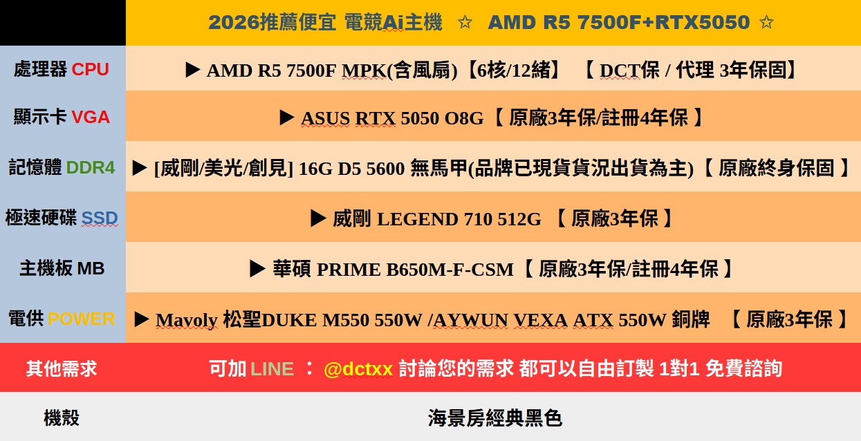 • 【DCT】2026推薦便宜電競Ai主機⭐AMD R5 7500F+RTX5050⭐5天出貨( B製程 ) (SAM-B2X-AD13) AMD R5 7500F MPK/ASUS RTX 5050 O8G/DDR5-5600 16GB/512GB SSD/B650M-F/550W